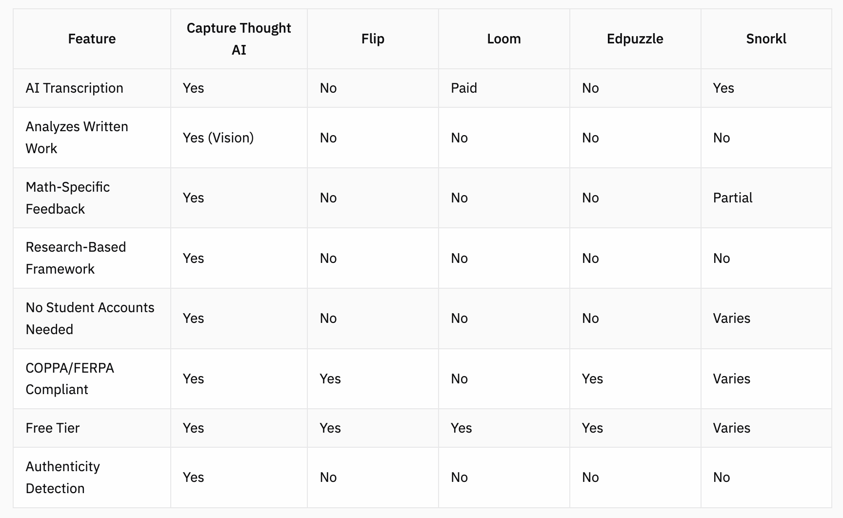Unique Advantage: Capture Thought AI is the only tool that analyzes both what students SAY and what they WRITE. This catches discrepancies that audio-only systems miss, like when a student says "I multiplied" but their written work shows addition.