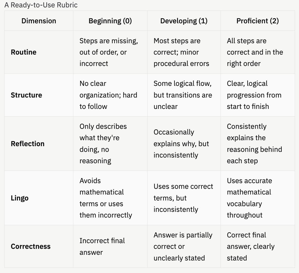 This rubric scales well across grade levels — the vocabulary and reasoning expected from an Algebra 1 student looks different from what you'd expect in Precalculus, but the dimensions stay consistent.